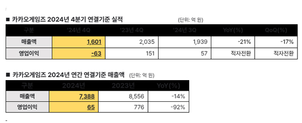 카카오게임즈의 2024년 4분기 매출은 약 1601억원, 영업손실은 약 63억원으로 전년 대비 각각 21% 감소 및 적자전환했다.