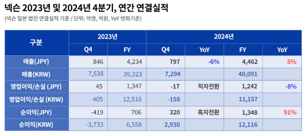 2024년 4분기 매출은 매출 797억엔(한화 7294억원), 영업이익은 -17억엔(한화 -158억원), 순이익은 320억엔(한화 2930억원) 기록을 기록했다.(환율은 100엔당 914.9원기준)