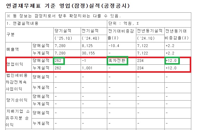 한진의 2025년 1분기 경영실적을 잠정 집계한 결과, 연결기준 매출액은 전년 동기 대비 2.2% 증가한 7280억 원, 영업이익은 12% 상승한 262억 원을 기록했다.
