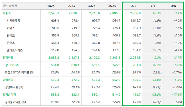 1분기 연결 매출액은 서치플랫폼, 커머스 등 주요 사업 부문의 견조한 성장으로 전년동기 대비 10.3% 증가한 2조 7868억 원을 기록했다. 조정 EBITDA는 전년 동기 대비 20.7% 증가한 7010억 원을 기록했다. 연결 영업이익은 전년 동기 대비 15.0% 증가한 5053억원으로, 영업이익률은 18.1%를 기록했다.