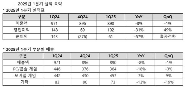 네오위즈의 1분기 매출은 890억원으로 견실한 실적 흐름을 이어갔다. 전분기 대비 1% 감소, 전년동기 대비로는 8% 감소했다.