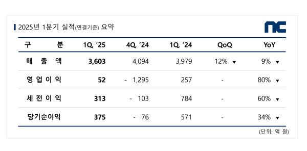 (서울=NSP통신) 이복현 기자 = 엔씨소프트(036570)가 2025년 1분기 실적 결산(연결기준) 결과 매출 3603억원, 영업이익 52억원, 당기순이익 375억 원을 기록했다.