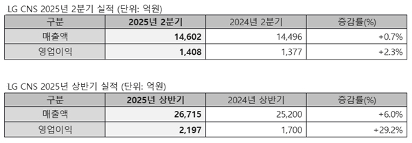 LG CNS는 2025년 2분기 연결기준 매출액 1조4602억원, 영업이익 1408억원을 기록했다. 전년동기 대비 매출은 0.7%, 영업이익은 2.3% 성장했다.