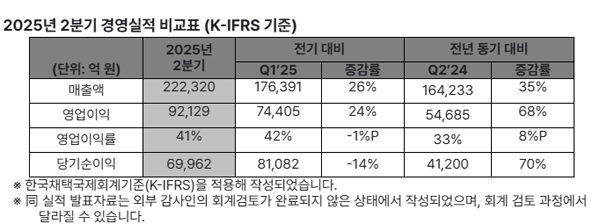 (서울=NSP통신) 이복현 기자 = SK하이닉스가 24일 실적발표회를 열고, 올해 2분기 매출액 22조2320억원, 영업이익 9조2129억원(영업이익률 41%), 순이익 6조9962억원(순이익률 31%)의 경영실적을 기록했다고 밝혔다.