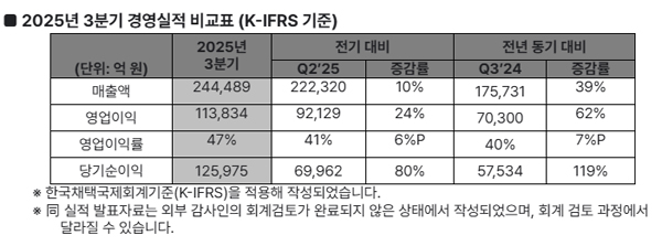 회사는 29일 실적발표를 통해 2025년 3분기 매출 24조4489억 원, 영업이익 11조3834억 원(영업이익률 47%), 순이익 12조5975억 원(순이익률 52%)을 기록했다고 밝혔다.