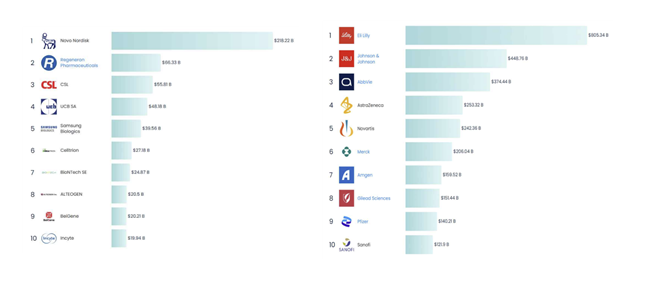 1위 제약기업은 시총 시총 8053억4000만 달러 미국 일라이릴리(Eli Lilly)로 나타났다. 뒤 이어 시총 4487억6000만 달러인 존슨앤존슨이 2위를 차지했다. 두 업체간 차이는 약 1.8배였다. 미국 외 기업으로는 영국 아스트라제네카(4위), 스위스 노바티스(5위), 프랑스 사노피(10위)가 10위권에 포함됐다. 또 일본, 중국, 인도 기업이 다수 포함됐다.