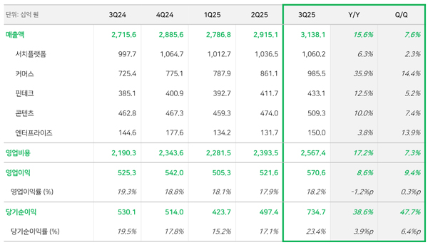 (서울=NSP통신) 이복현 기자 = 네이버(035420)가 2025년 3분기 연결 매출 3조 1381억원, 영업이익 5706억 원, 당기순이익 7347억 원을 기록했다고 밝혔다.