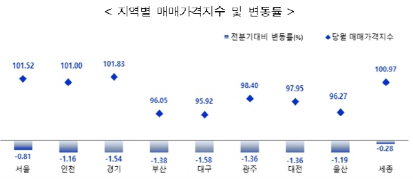 그 중 수도권(1.15%)과 지방(1.36%)은 하락했다. 시도별로는 대구(-1.58%), 경기(-1.54%), 부산(-1.38%), 광주(-1.36%), 대전(-1.36%) 순으로 하락세를 보였다.