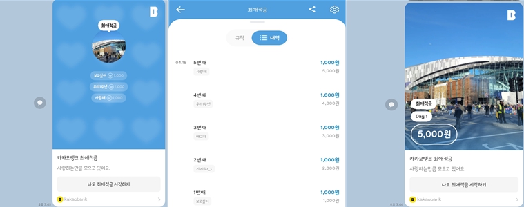만약 카카오뱅크 최애적금에서 조건으로 ‘사랑해’ ‘보고싶어’ ‘귀엽다’를 설정한 뒤 각 1000원씩 3000원을 모으면 SNS 공유 화면에는 ‘최애적금’이라는 이름과 사진, D-DAY, 총 모은 금액만 표시된다. 규칙을 그때그때 바꿔 이어붙이면 한 편의 편지로도 만들 수 있는데 카카오뱅크 앱 공유 기능으론 그것이 불가능하다. 조건을 표시해주는 공유템플릿도 있지만 편지 형식으로 전체를 공유하려면 ‘내역’ 화면을 캡처해야 한다.