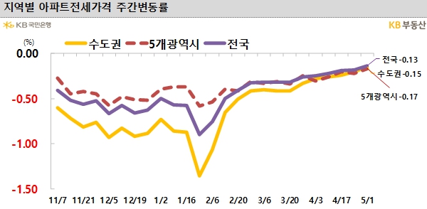 KB부동산은 지난 1일 발표한 ‘주간 KB주택시장동향’ 자료에 따르면 전국 아파트 전세가는 -0.13%로 하락폭이 줄었다고 밝혔다.