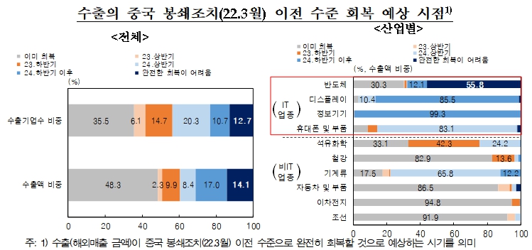 중국과 경합도가 높은 IT업종의 회복이 글로벌 수요 악화, 미국·유럽 자국 우선주의 정책 등 구조적 요인으로 대체로 늦어지는 가운데 반도체 업체의 과반수 이상은 내년 하반기 이후에도 수출이 중국의 봉쇄조치 이전 수준으로 회복이 어렵다고 응답했다.