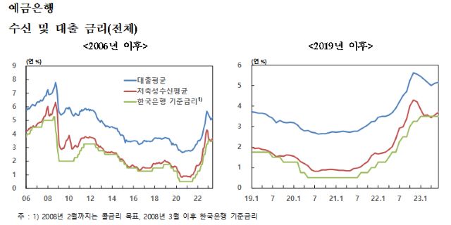 신규취급액 기준 대출금리와 저축성수신금리 차, 즉 예대금리차는 수신금리가 대출금리보다 크게 상승함에 따라 4개월 연속 축소됐다.