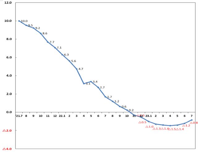 (서울=NSP통신) 강수인 기자 = 2021년부 7월부터 우하향하던 그래프가 2023년 4월 이후 조금씩 우상향하고 있다. 이 그래프는 2021년 7월부터 2023년 7월까지 가계대출 증가율을 보여준다. 즉 지난 4개월간 가계대출 감소폭이 줄어들며 그래프가 다시 오름세를 보이고 있다.