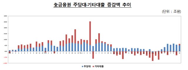 주담대는 5조 2000억원 증가해 전월(5조 7000억원) 대비 증가폭이 축소됐다. 제2금융권이 감소세가 지속된 가운데 은행권은 증가세가 다소 둔화됐다. 기타대출은 전월 추석 상여금 유입 등으로 크게 감소(-3조 3000억원)한데 대한 기저효과 등으로 총 1조 1000억원 증가했다.