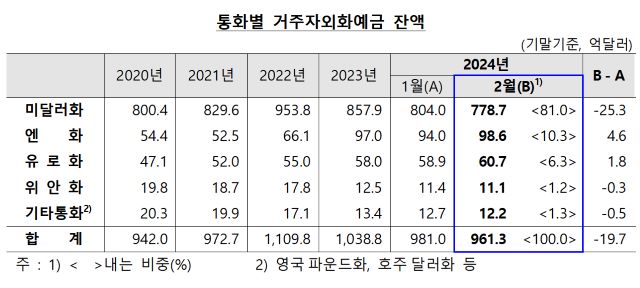 19일 한국은행이 발표한 ‘2024년 2월중 거주자외화예금 동향’에 따르면 지난달 외국환은행의 거주자외화예금 잔액은 961억 3000만달러(128조 7084억 5700만원)로 집계됐다. 달러화, 기업예금을 중심으로 전월말 대비 19억 7000만(2조 6376억 3300만원)달러 감소했다.
