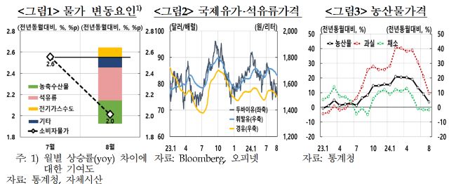 한은에 따르면 석유류 가격은 국제유가 하락 등의 영향으로 오름폭이 상당폭 축소됐으며 농산물가격 상승률은 폭염에 따른 일부 채소가격 상승에도 불구하고 햇과일 출하 등으로 둔화 흐름을 지속했다.