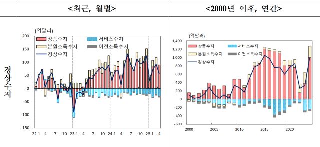 10일 한국은행이 발표한 ‘2025년 4월 국제수지(잠정)’에 따르면 지난 4월 경상수지는 57억달러(7조 7451억 6000만원)로 24개월 연속 흑자를 나타냈다. 다만 흑자 폭은 전월 대비 34억 4000만달러 감소했다.