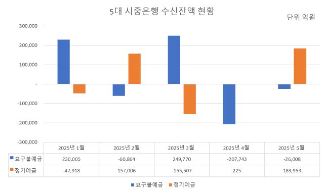 5대 시중은행의 정기예금 잔액은 지난 3월 15조 5507억원 감소한 뒤 4월 225억원 소폭 늘었다가 지난달 18조 3953억원 증가했다.