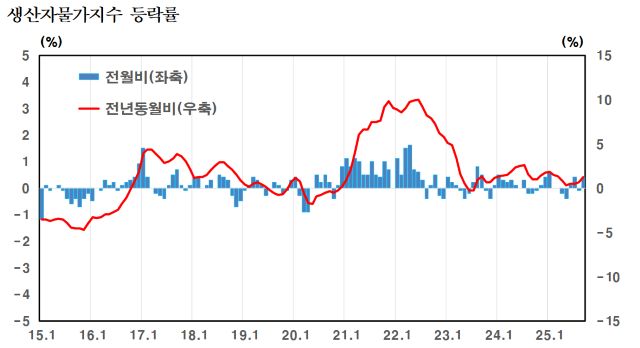 22일 한국은행이 발표한 ‘2025년 9월 생산자물가지수(잠정)’에 따르면 지난달 생산자물가지수는 전월 대비 0.4% 상승했다. 전년동월대비로는 1.2% 상승이다.