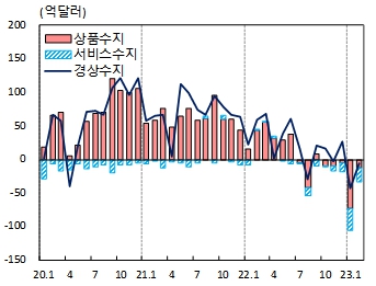 항목별로는 상품수지가 13억달러(1조 7153억 5000만원) 적자, 운송, 여행 등의 증가로 서비스수지가 20억 3000만달러(2조 6785억 8500만원) 적자를 기록했다. 본원소득수지는 배당수입 증가 등으로 31억 2000만달러(4조 1168억 4000만원) 흑자로 나타났다.