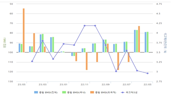 금리전망 BMSI는 91로 전월(61)대비 개선됐다. 글로벌 경기침체 우려 및 주요국 긴축 사이클 종료에 대한 기대감으로 5월 금리하락 응답자가 증가한 것으로 조사됐다. 금리하락 응답자 비율은 23%(전월 8%)로 전월 대비 15%p 상승했고 응답자의 32%(전월 47%)가 금리 상승에 응답해 전월대비 15%p 하락한 것으로 나타났다.