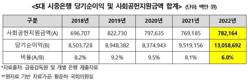 5대 시중은행의 2022년 사회공헌지원금액 합계는 7821억원으로 2022년 당기순이익 합계 13조 586억원의 6.0% 규모로 나타나 2018년 8.2%, 2019년 9.2%, 2020년 9.5%, 2021년 8.1%와 비교해 가장 낮은 수치를 보였다.