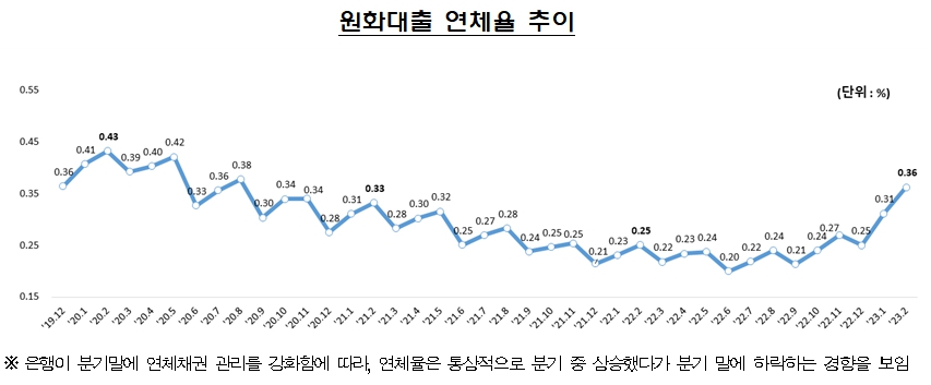 25일 금융감독원이 발표한 ‘2023년 2월말 국내은행의 원화대출 연체율 현황(잠정)’에 따르면 지난 2월말 국내은행의 원화대출 연체율은 0.36%로 전월말 대비 0.05%p 상승했다.