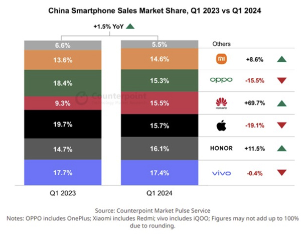 (서울=NSP통신) 이복현 기자 = 카운터포인트리서치의 마켓 펄스 서비스에 따르면 2024년 1분기 중국의 스마트폰 판매량이 전년 동기 대비 1.5% 증가하며 2분기 연속 성장세를 기록했다.