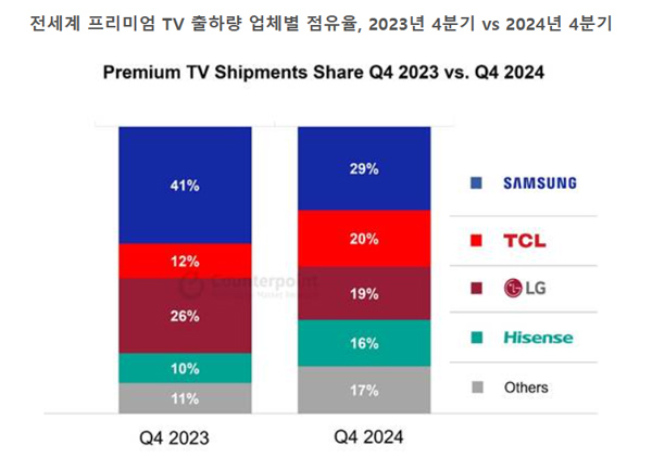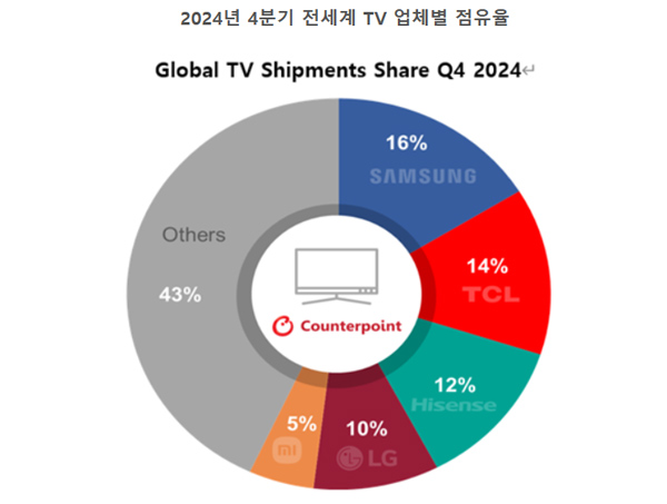 2024년 4분기 삼성전자는 16%의 점유율로 1위 자리를 지켰으나 TCL이 14%의 점유율로 2위를 차지하며 삼성전자를 맹추격 중이다. LG전자는 전년 동기와 비슷한 10%의 점유율로 4위를 유지하고 있다.