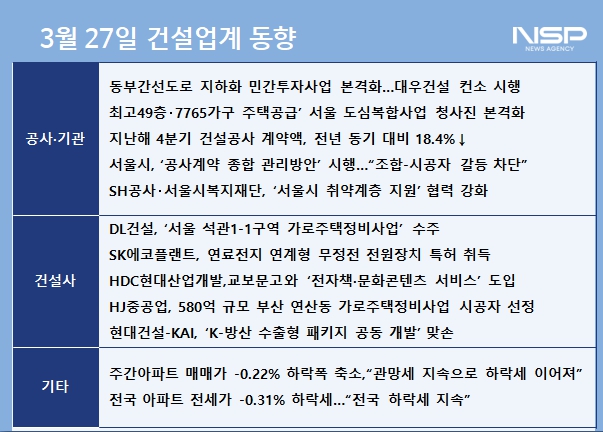 동부간선도로 지하화 민간투자사업 대우건설 컨소 선정…지난해 4분기 건설공사 계약액 감소세