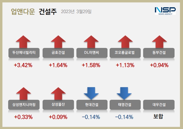 (서울=NSP통신) 정의윤 기자 = 29일 코스피(+0.37%)와 코스닥(+1.25%)는 상승세를 보였다. 건설주는 전일 대비 +0.82% 상승했다. 건설주는 80종목 가운데 46종목이 상승, 25종목이 하락했다. 보합세는 9종목이다.