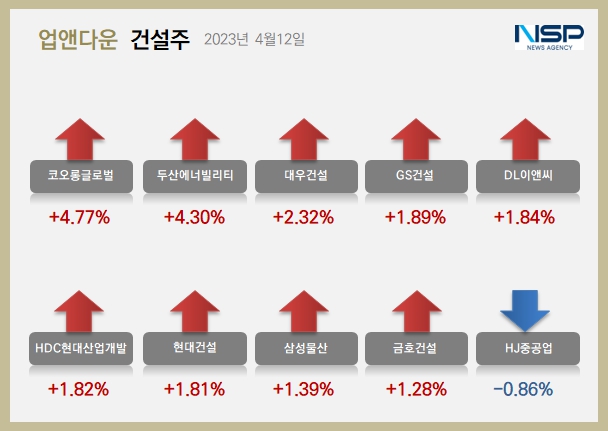 (서울=NSP통신) 정의윤 기자 = 12일 코스피(+0.11%)와 코스닥(-0.93%)는 상승과 하락이 엇갈렸다. 건설주는 전일 대비 +0.45% 상승했다. 건설주는 80종목 가운데 62종목이 상승, 15종목이 하락했다. 보합세는 3종목이다.