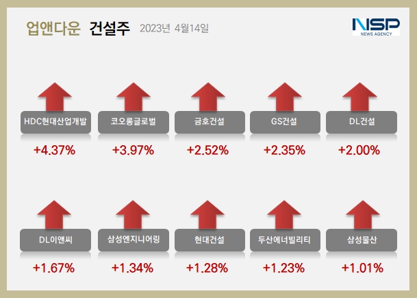 (서울=NSP통신) 정의윤 기자 = 14일 코스피(+0.38%)와 코스닥(+1.07%)는 상승세를 보였다. 건설주는 전일 대비 +1.70% 상승했다. 건설주는 80종목 가운데 68종목이 상승, 7종목이 하락했다. 보합세는 5종목이다.