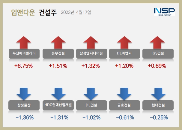 (서울=NSP통신) 정의윤 기자 = 17일 코스피(+0.17%)와 코스닥(+0.63%)는 상승세를 보였다. 건설주는 전일 대비 +0.63% 상승했다. 건설주는 80종목 가운데 47종목이 상승, 30종목이 하락했다. 보합세는 3종목이다.