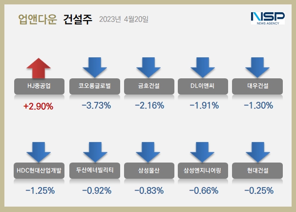 (서울=NSP통신) 정의윤 기자 = 20일 코스피(-0.46%)와 코스닥(-2.58%)는 하락세를 보였다. 건설주는 전일 대비 -1.66% 하락했다. 건설주는 80종목 가운데 11종목이 상승, 67종목이 하락했다. 보합세는 2종목이다.