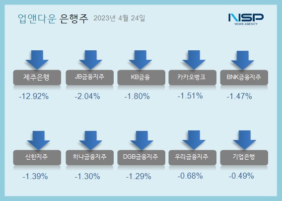 (서울=NSP통신) 강수인 기자 = 24일 코스피(-0.82%)와 코스닥(-1.56%)은 모두 하락한 가운데 은행주는 전거래일 대비 1.43% 하락했다. 은행주는 11종목 가운데 1종목이 상승, 10종목이 하락했다.