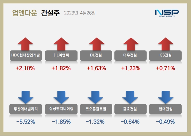 (서울=NSP통신) 정의윤 기자 = 26일 코스피(-0.17%)와 코스닥(0.99%)는 하락세를 보였다. 건설주는 전일 대비 -0.59% 하락했다. 건설주는 80종목 가운데 25종목이 상승, 50종목이 하락했다. 보합세는 5종목이다.