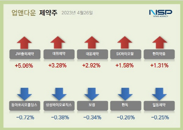 반면 삼성바이오로직스(-0.38%) 보령(-0.34%) 한독(-0.26%) 일동제약(-0.25%) 등이 하락했다.