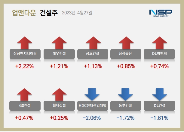 그 외 삼성물산(+0.85%),DL이앤씨(+0.74%),GS건설(+0.47%),현대건설(+0.25%)순으로 상승한 가운데 대우건설, 삼성물산, DL이앤씨, GS건설은 2거래일연속 상승세를 보였다.