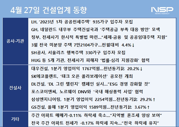 (서울=NSP통신) 정의윤 기자 = 이날 GS건설과 삼성엔지니어링의 영업이익이 상승세를 기록한 가운데 대우건설만 영억이익이 하락세를 기록했다. 이와 함께 정부는 전세사기 피해자를 위한 2년 한시적 특별법을 제정해 발표했다.