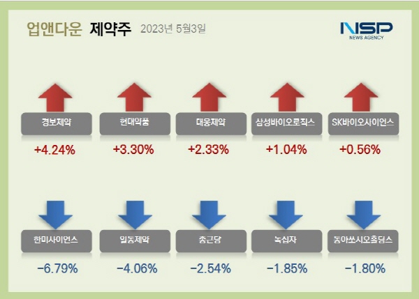 반면 일동제약(-4.06%) 종근당(-2.54%) 녹십자(-1.85%) 동아쏘시오홀딩스(-1.80%) 부광약품(-1.50%) SK바이오팜(-1.01%) 셀트리온(-0.87%) 등이 하락했다.