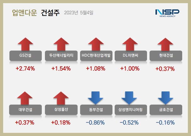 (서울=NSP통신) 정의윤 기자 = 4일 코스피(-0.02%)와 코스닥(+0.22%)는 상승과 하락이 엇갈렸다. 건설주는 전일 대비 0.25% 상승했다. 건설주는 80종목 가운데 39종목이 상승, 37종목이 하락했다. 보합세는 4종목이다.
