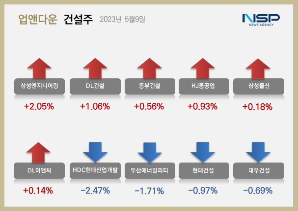 이외에도 HJ중공업(+0.93%),삼성물산(+0.18%),DL이앤씨(+0.14%)순으로 상승했다.