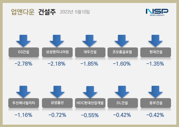 코오롱글로벌(-1.60%),현대건설(-1.35%),두산에너빌리티(-1.16%),삼성물산(-0.72%),HDC현대산업개발(-0.55%),DL건설(-0.42%),동부건설(-0.42%)순으로 하락했다.