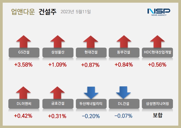 그 외 동부건설(+0.84%),HDC현대산업개발(+0.56%),DL이앤씨(+0.42%)금호건설(+0.31%)순으로 상승했다. 이 중 삼성물산, 현대건설, HDC현대산업개발, 동부건설은 지난 10일 하락세에서 상승세로 전환했다.