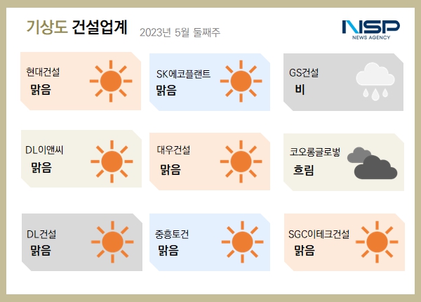 (서울=NSP통신) 정의윤 기자 = 2023년 5월 2주차 건설업계기상도는 현대건설·DL이앤씨·SK에코플랜트·대우건설·DL건설·중흥토건·SGC이테크건설의 ‘맑음’, 코오롱글로벌의 ‘흐림’, GS건설의 ‘비’로 기록됐다.