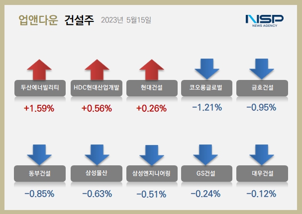 (서울=NSP통신) 정의윤 기자 = 15일 코스피(+0.16%)와 코스닥(-0.96%)는 상승과 하락이 엇갈렸다. 건설주는 전일 대비 0.07% 하락했다. 건설주는 80종목 가운데 23종목이 상승, 49종목이 하락했다. 보합세는 8종목이다.