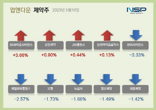 (서울=NSP통신) 김다은 기자 = 16일 코스피(+0.04%)와 코스닥(+0.27%)이 모두 상승한 가운데 제약주(-0.24%)는 하락했다. 이중 상승주는 44개였고 하락주는 115개였다. 보합세는 7종목이다.
