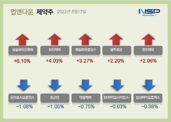 이 밖에 경보제약(+2.06%) 더메디팜(+1.84%) 현대약품(+1.81%) 한미약품(1.66%) 한독(+1.34%) 한미사이언스(+1.19%) 유한양행(+1.05%) SK바이오팜(+0.71%) 삼일제약(+0.54%) 대웅제약(+0.45%) 녹십자(+0.40%) 보령(+0.35%) 종근당바이오(+0.19%) 등이 상승했다.