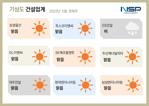 (서울=NSP통신) 정의윤 기자 = 2023년 5월 3주차 건설업계기상도는 삼성물산·DL이앤씨·대우건설·포스코이앤씨·SK에코플랜트·현대엔지니어링·삼성엔지니어링·두산에너빌리티의 ‘맑음’, GS건설의 ‘비’로 기록됐다.